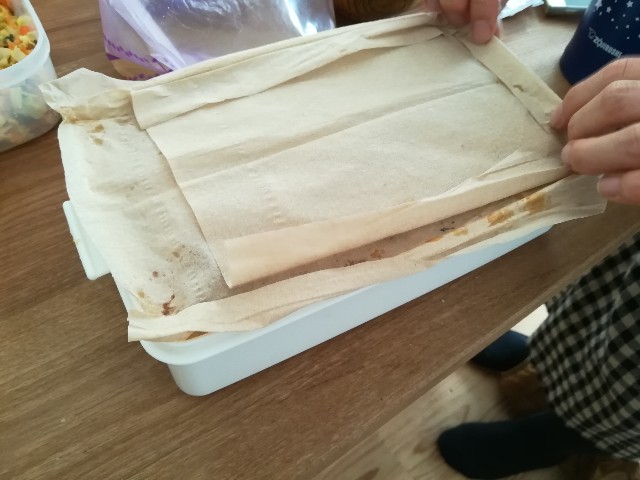 キッキンペーパーを引いて、ラップをすると良いそう